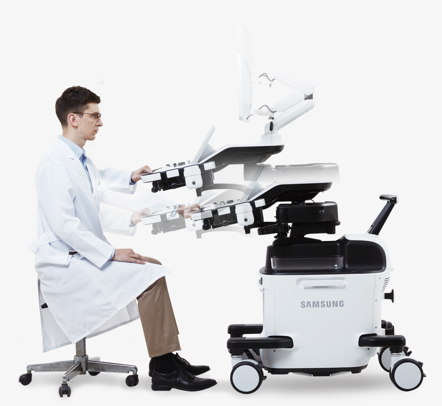 Mit FreeForm widmet sich Samsung einem Designthema, das Ihnen komfortable Arbeitsbedingungen bietet,indem unnötige Bewegungungen bei der Diagnosestellung verringert werden. Das Ziel von Samsung ist es, die Arbeitsumgebung des Benutzers durch weitreichende Einstellmöglichkeiten des Bedienfeldes, unter Berücksichtigung der Armreichweite, zu verbessern und ebenfalls eine angenehme Beinfreiheit zu bieten.